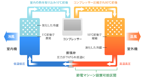 節電マシーンは、空調機の冷媒に作用して、空調機の消費電力を削減させる装置です。